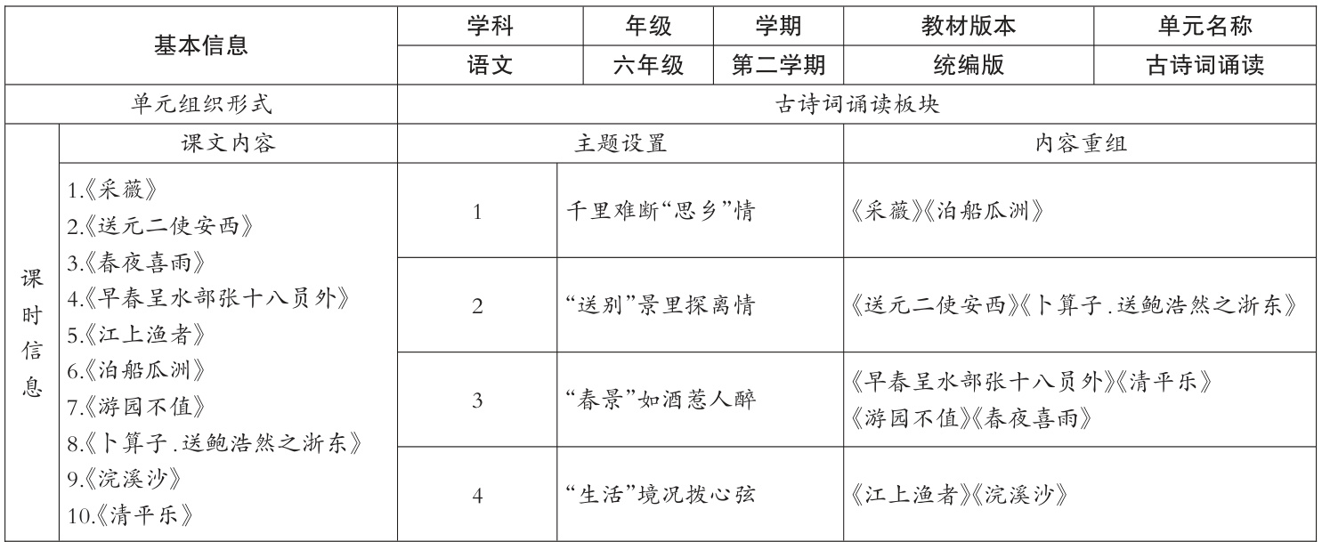 在上述基础上,教师需解读教材。统编版六年级下册的“古诗词诵读”板块是该册书最后一部分内容,旨在帮助学生进一步增加古诗词积累,并尝试迁移运用之前掌握的学习方法,自主疏通诗词大意,为更高年段的学习做好准备[5]。该板块选取了十首古诗词,体现了“诗中有画、画中有诗”的意境,有助于学生提高审美鉴赏能力。从整体编排来看,这些古诗词的意象丰富多样,涵盖了多个主题。教师可以将这十首古诗根据主题进行重组,围绕“思乡”“送别”“春景”“生活”四个主题组建学习任务群(如表1)。
