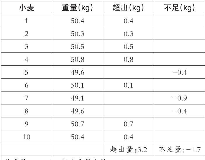 第二种解题思路是运用与标准重量进行比较的方法计算。首先,将每袋超出 50kg 标准的小麦重量记作正数,不足 50kg 的小麦重量记作负数,具体记录形式如下: