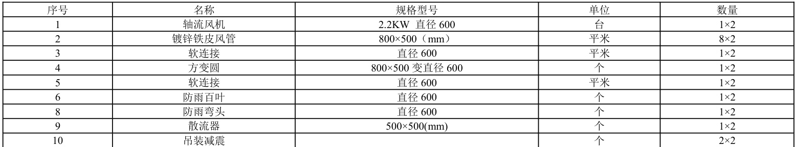 轴流风机、镀锌铁皮风道、软连接、方变圆、吊装减震、防雨弯头,防雨百叶,角铁圆法兰及安装辅材。以 1 号机组为例,具体材料见表 4-1。