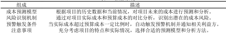 预警系统是预算控制的辅助工具,通过对项目成本进行实时监控和预测分析,及时发现潜在的成本风险并提前进行预警详见表1。