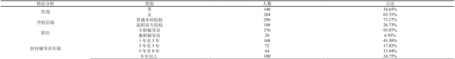 研究对象以中青年辅导员为主体,年龄集中在25-40 岁之间,女性占比显著高于男性,这与高校辅导员职业性别分布特征相符。从学历结构看,硕士学历占主导地位,博士学历比例相对较低。工作年限分布呈现两极特点,1-3 年新任辅导员和8 年以上资深辅导员构成主要群体,中间年限存在明显断层。职称结构显示中级及以下职称占绝大多数,高级职称比例偏低。在学校类型方面,普通本科院校辅导员占比最高,高职高专院校次之,双一流高校相对较少。婚姻状况以已婚为主,未婚比例约占三成,部分辅导员反映家庭工作难以平衡。个人信息统计如表1 所示。
