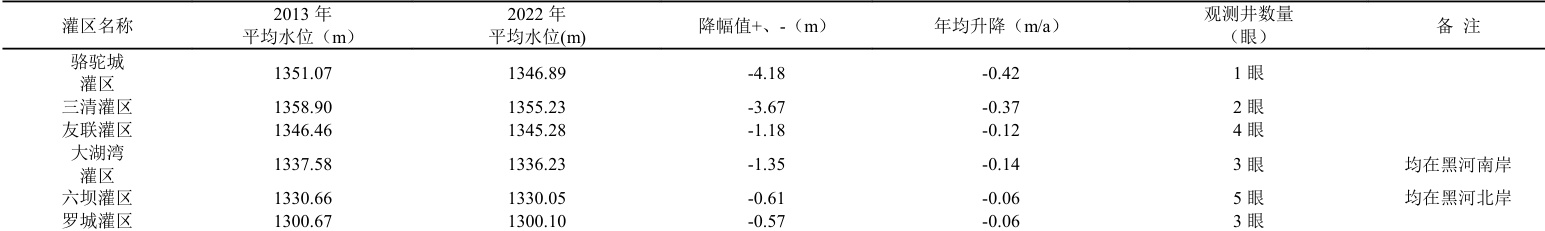 骆驼城灌区现有观测井 1 眼,经观测 2013 年地下水平均水位为 1351.07m ,与 2022 年平均水位 1346.89m相比下降 4.18m ,年平均下降 0.42m ,现状地下水埋深 33m;三清渠灌区现有观测井 2 眼,经观测 2013 年地下水平均水位为 1358.9m,与 2022 年平均水位 1355.23m相比下降 3.67m ,年平均下降 0.37m ,现状地下水埋深 10m;友联灌区现有观测井 4 眼,经观测2013 年地下水平均水位为 1346.46m,与 2022 年平均水位 1345.28m相比下降 1.18m,年平均下降 0.12m ,现状地下水埋深 5m;大湖湾灌区现有观测井 3 眼,均在黑河南岸,经观测 2013年地下水平均水位为 1337.58m ,与 2022 年平均水位 1336.23m相比下降 1.35m ,年平均下降0.14m ,现状地下水埋深 3m;六坝灌区现有观测井 5 眼,均在黑河北岸,经观测 2013 年地下水平均水位为 1330.66m ,与 2022 年平均水位 1330.05m 相比下降 0.61m ,年平均下降 0.06m ,现状地下水埋深 3m;罗城灌区现有观测井 3 眼,经观测 2013 年地下水平均水位为 1300.67m ,与 2022 年平均水位 1300.10m相比下降 0.57m ,年平均下降 0.06m ,现状地下水埋深 2m。(具体见下表)