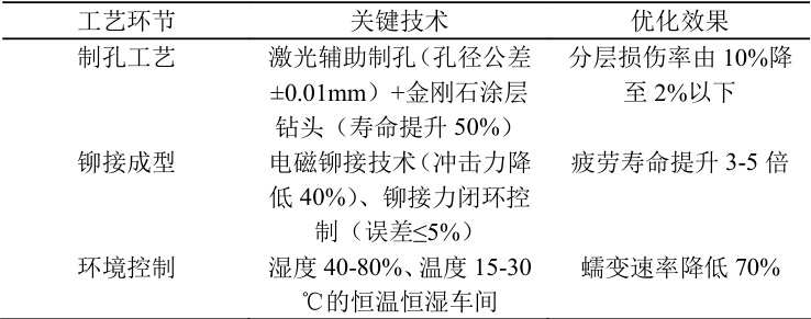 综上所述,综合工艺参数优化、新型连接技术应用及标准化规范(如GB/T 38825),可显著提升复合材料-金属铆接接头的综合性能,满足航空结构轻量化与高可靠性的双重需求。通过材料-工艺-检测全链路协同优化,复合材料-金属铆接接头的综合性能(强度、耐久性、环境适应性)可实现系统性提升,满足下一代飞机轻量化与高可靠性需求。