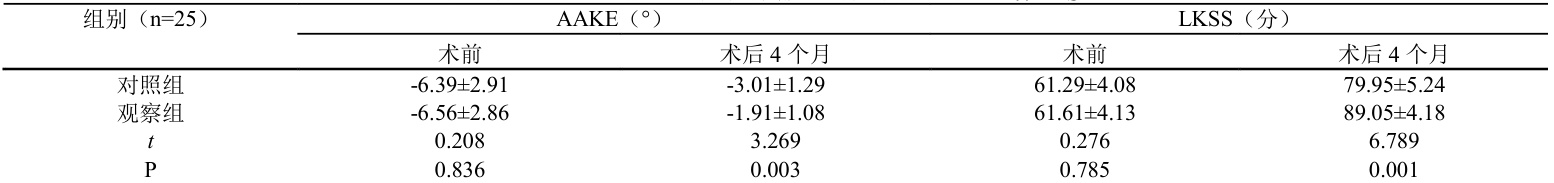 结合表1 数据得知,观察组患者术后4 个月AAKE、LKSS治疗数据均优于对照组患者( |P<0.05| ),组间有统计学意义。