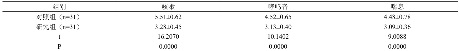 哮喘是一种影响呼吸道健康的常见慢性疾病,病因复杂,涉及环境、遗传、生活方式等多种因素。有数据显示,该病在最近几年时间内的患病总率不断升高,以老年人群居多,对其呼吸功能造成直接影响,同时也会降低患者的生活质量[2]。糖皮质激素是临床推荐用药,以布地奈德最为多见,在小剂量用药下能够通过抑制炎症反应、降低气道高反应等机制来缓解症状。因老年患者机体素质较差,对药物反应不佳,所以难以在短时间内达到预期疗效[3]。因此,选择另外一种有效、安全的药物进行联合治疗十分重要,能够进一步提高病症改善效果。多索茶碱属于支气管扩张剂,这种药物能够直接作用于呼吸道,帮助放松气管周围的肌肉,从而打开呼吸通道,使患者呼吸更加顺畅,在与小剂量布地奈德联合用药后,能够促进症状缓解,并加快患者的康复进程[4]。结合本次课题结果分析,基于治疗方案的差异,对患者症状消失时间统计,可知研究组咳嗽( 3.28±0.45⋅ )d、哮鸣音( 3.13±0.40 )d、喘息( 3.09±0.36 )d 等各项时间均较短, P<0.05 ;评价整体疗效,计算得到对照组和研究组总有效率分别为 80.65% 和96.77% ,后组相对较高, P<0.05 ,以上结果表明,在研究组治疗方案下,患者症状改善速度更快,疗效更佳。原因在于布地奈德、多索茶碱联合使用能够起到协同效应,具有抗炎、扩张气管、缓解呼吸困难等多种作用,进而抑制哮喘发作,并维持气道的健康状态。