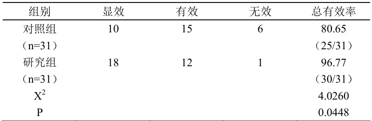 2.2 临床疗效分析对比研究组有效率较高, P<0.05 。详见表2.
