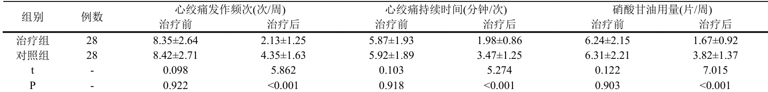 表1 两组患者治疗前后心绞痛发作情况比较 ( x s )