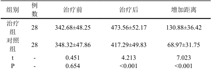 治疗组患者6 分钟步行距离提高幅度大于对照组,( P<0.05 )。见表2。表2 两组患者治疗前后6 分钟步行距离比较 (