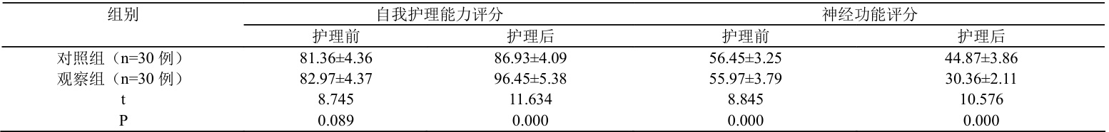 护理前组间自理能力评分均无差异 P>0.05 ,护理后对照组患者自理能力评分同观察组比较低 P<0.05 ,具有差异性,护理前神经功能评分组间均无差异 P<0.05 ,护理后对照组比观察组高 P<0.05 ,具有差异性,见表2.