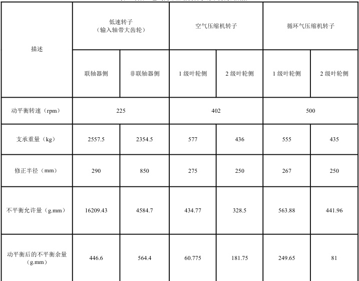 在项目的执行阶段,日本神钢(Kobelco)最终获得压缩机的制造合同。在压缩机制造阶段,厂家按照前期的有关低速动平衡的技术求严格执行。买方也参与了动平衡的工厂见证,动平衡精度都达到G1.0 对应的不平衡允许量的要求,相关动平衡数据见表-1。