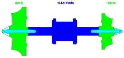上文中提到的某项目联合工艺气离心压缩机组,其包括空气用压缩机和循环气用压缩机,由低速轴(带大齿轮)分别驱动空气压缩机转子(包括带小齿轮的轴、两个叶轮和叶轮缩紧螺母等)和循环气压缩机转子(包括带小齿轮的轴、两个叶轮和叶轮缩紧螺母等)高速转动,为整体齿轮式离心压缩机,与上图-2 的结构相同。