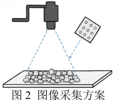 在机器视觉应用于路面骨料级配识别时,图像采集方案的设计至关重要。首先要确定合适的拍摄角度和距离,以确保能够完整地拍摄到骨料样本,如图2 所示。拍摄角度如果不合适,可能会导致部分骨料被遮挡,影响后续的分析。距离过近或过远也会影响图像的清晰度和骨料的成像比例。其次,要选择合适的照明方式,由于骨料表面的粗糙度和颜色差异,不同的照明方式会产生不同的成像效果。