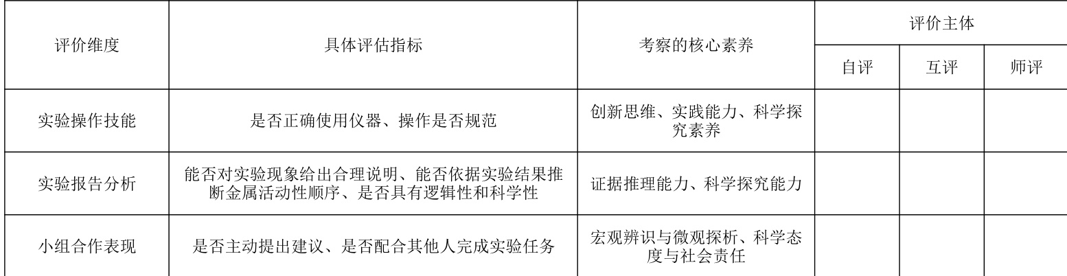 科学、全面的教学评估体系,能够有效反映学生的学习成果和素养提升情况。在核心素养导向下,教师应构建多维度的评估体系,全面、客观地评价学生的综合素养,以帮助学生发现自身的优势与不足,明确改进方向[2]。例如,在“常见金属的物理性质和化学性质”的实验活动中,教师可以通过设计清晰的评估指标(表 1),对学生的知识盲点和技能短板进行精准定位,并以此作为参考依据调整教学策略,从而更好地激发学生的学习动力和学习方向,促使其实现知识、能力、素养的协同发展。