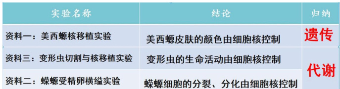 则资料但是资料较多,课堂上难以逐个分析。因此笔者选择伞藻作为重点实验对象,初步得出细胞核的功能,其他资料作为补充证据最终总结归纳建构概念。
