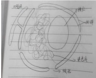 任务 1:学生绘制细胞核的模式图,注明各部分名称。组内展示各自成果(见下图),学生自评、互评并修改细胞核结构图,并对自学过程产生的疑惑进行研讨交流。
