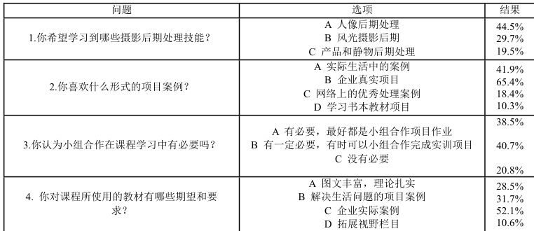 针对以上调查结果,笔者对《摄影后期处理》课程的项目化教学开展进行了思考,并给出以下几点建议:1)优化课程教学大纲和教材
