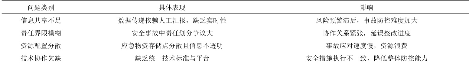 ① 信息滞后与孤岛化:各方信息系统相互独立,数据接口缺乏统一标准,导致安全信息共享不畅。