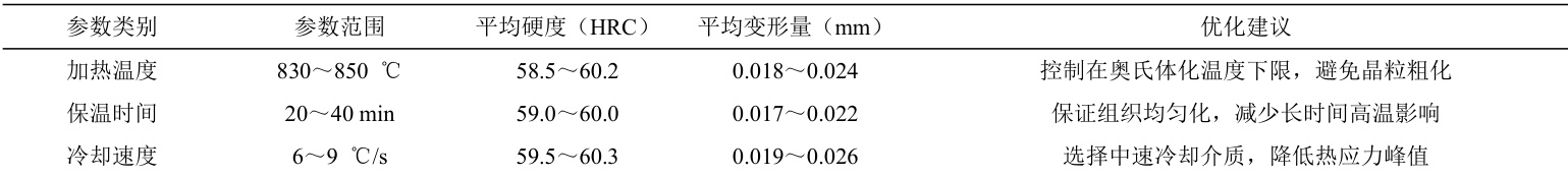 在精密齿轮的热处理过程中,常见的关键参数包括加热温度、保温时间与冷却速度。它们不仅对材料的硬度与组织结构有显著影响,也直接决定了变形程度。通过对典型生产条件的统计分析,可以得到不同参数区间下的变形量变化规律,如表1 所示。