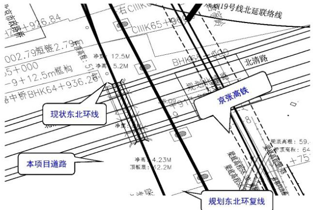 (1)整体布局统筹兼顾、经济合理,以确保实施的可行性。(2)设计必须满足现行国家有关规范和有关规定,经济节省、便于施工和养护管理。(3)桥梁设计和施工应满足铁路规划要求。(4)桥梁设计和施工必须确保铁路运营安全。(5)桥梁设计方案应最大限度地减少由于桥梁建设引起的铁路运营损失。(6)不得恶化既有铁路运营条件。(7)为铁路的远期发展预留空间 。2.2 桥下净高确定原则(1)施工过程中梁底至电气化铁路带电体最小净距按不小于1.0m控制。(2)桥下铁路行车界限,东北环线铁路考虑规划双层集装箱运输条件,界限净空按7.96m,考虑沉降及路基道床沉落整治余量按8.5m控制。(3)桥梁投影范围内无接触网支柱,临近接触网支柱距离桥梁边缘净距均大于5m。