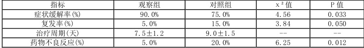 本研究着重对比了症状缓解率、复发率、整体治疗周期以及药物不良反应情况等诸多关键性指标,具体地分析了中药汤剂是否相较于其他治疗方式展现出更高的疗效表现以及更低的疾病复发概率。结果显示,观察组在症状缓解率、复发率方面均呈现出优于对照组的明显趋势,且治疗周期相较于对照组更为短暂,同时药物不良反应的发生率也维持在了一个更低的水平。这些研究结果显示,中药汤剂在显著提升治疗效果、进一步降低疾病复发率方面展现出了尤为明显的优势。如表1 详细数据所示。
