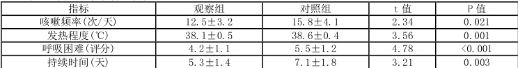 ②症状改善的具体指标涵盖了咳嗽的频率(次/天),详细记录了每天的咳嗽次数;发热的程度(℃),精确测量了体温数值;呼吸困难的评分(0-10 分制),通过标准化评分系统进行了评估;以及这些症状持续的时间(天),详细记录了从开始到缓解的天数。咳嗽的频率和具体的发热程度是通过详细记录并分析患者的症状表现而得出的,呼吸困难则是依据特定的评分标准进行全面评估,其持续时间则是通过精确记录患者症状从开始显现到完全消失的时间段来确定。