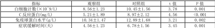在本研究中,我们尤其着重监测了白细胞计数、C 反应蛋白以及免疫球蛋白水平等多项关键炎症指标的具体变化情况,旨在细致评估中药汤剂相较于其他治疗方式,是否展现出更为出色的炎症控制成效。结果显示,观察组在各项检测指标上的数据均明显低于对照组,这一显著差异进一步验证了中药汤剂在有效控制炎症症状方面所展现出的突出优势。如表3 详细数据所示。