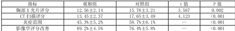 ④影像学评分具体涵盖了胸部X 光片评分与CT 扫描评分(评分越低,代表肺部炎症程度越轻)、炎症范围(百分比数值越低,则意味着炎症波及的区域越小),以及影像学评分的改善情况(百分比数值越高,显示出影像学评分的提升越显著)。通过高精度专业影像学设备进行全面细致的检测,并依据所得数据进行了科学严谨的评估。