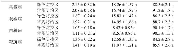 具体而言,对于为害最为严重的霜霉病,绿色防控区末期病情指数为18.26,防治效果达到 88.5% ,虽略低于常规防治区的 91.2% ,但统计分析表明两者差异未达显著水平。对于灰霉病和白粉病,两种处理间的防治效果同样无显著性差异。结果表明,本集成技术体系通过多种措施协同作用,能够有效替代常规化学防治模式,实现对黄瓜主要病害的绿色和可持续控制。