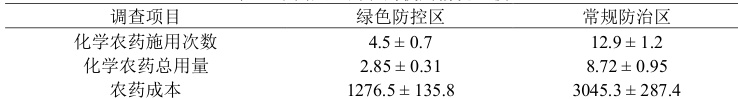 试验共设置两个处理。处理一为绿色防控技术集成区,全程应用本研究集成的绿色防控技术体系。处理二为常规化学防治对照区,完全按照当地农户习惯的用药方案进行管理。
