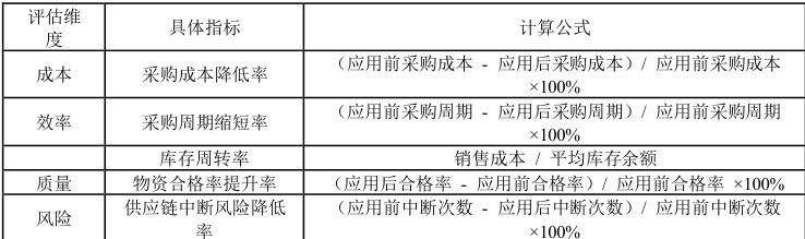 采购成本降低率反映了物联网技术在降低采购成本方面的作用;采购周期缩短率和库存周转率体现了采 供应链中断风险降低率则