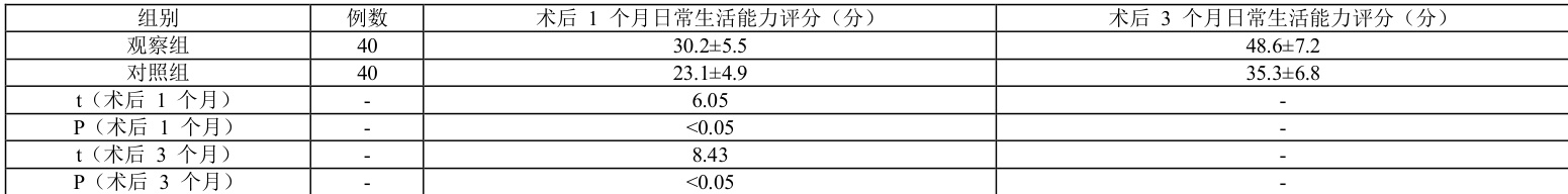 术后 1 个月、3 个月,观察组日常生活能力评分均显著高于对照组,差异有统计学意义( P<0.05 )。具体数据见表 2。
