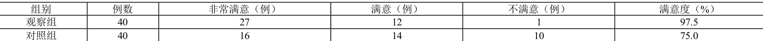 观察组护理满意度为 97.5% (39/40),显著高于对照组的 75.0% (30/40),差异有统计学意义( ⋅x2=8.57 , P<0.05 )。具体数据见表 3 。