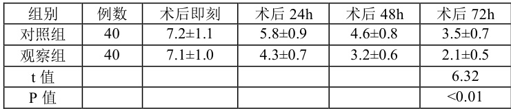 观察组术后 24h、48h、72hVAS 评分均显著低于对照组( P<0.01 表 1 两组患者术后不同时间点 VAS 评分比较(分, x±s )