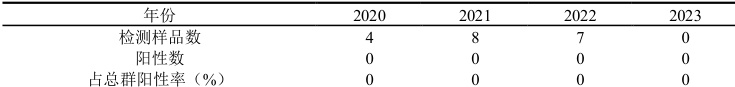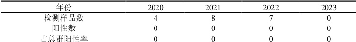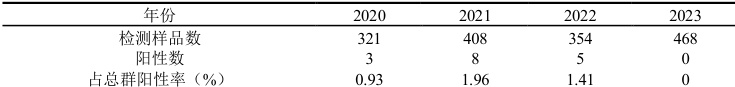 从表看出,在 2020 年至 2023 年期间,围绕奶牛场布鲁氏菌病防疫工作这一关键任务,实施系统血样采集及检测,对奶牛血样实施初筛工作,采用手段为快速血凝试验,接着利用补体结合试验(SAT)和竞争性酶联免疫吸附实验(cELISA)开展复检工作。RBT 检测结果呈现,从 2020 年至 2023 年这一时间段,从 2020 年到 2023 年,阳性率依次呈现为 1.25% 、 1.96% 、1.98%和 0;iELISA 检测呈现的数据为 0.93% 、 1.96% 、 1.14% 以及 0,在连续 4 年中,SAT 阳性率持续逐年降低,其数值分别为 0.60% 、0.32% 、0、0、0 和 0;cELISA 历经四年,均未检索到阳性情况,这些结果呈现出,经过为期 4 年监测,尽管 RBT 和 iELISA 两项检测均呈现出阳性初筛结果,然而通过 SAT 和 cELISA 开展确诊检查后,未查找到感染病例,体现出该奶牛场在布病防控方面达成了显著成效。