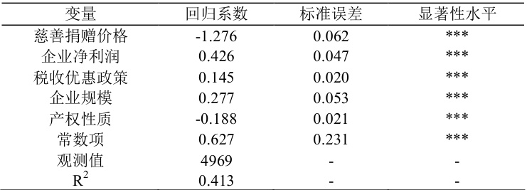 从表 1 可见,慈善捐赠价格对企业慈善捐赠支出具有显著负影响,表明税收优惠力度越大(企业实际捐赠成本越低),企业慈善捐赠意愿越强;企业净利润显著正相关,盈利能力越强,企业捐赠规模越大;税收优惠政策显著提升企业慈善捐赠行为,体现政策激励效应。