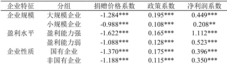 表 2 展示了不同特征企业对税收优惠政策响应程度的差异性。总体来看,规模较大、盈利能力较强和国有性质企业,对慈善捐赠价格变化和税收政策调整的响应更为明显,说明这些企业更容易受到税收优惠政策激励,政策效果更显著。