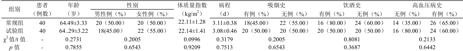 选取我院 2023 年 1 月 ~2023 年5 月急性脑梗死肝阳上亢证患者 80 例,常规组,女、男各 20、20 例, 57~79 岁。试验组,女、男各 18、22 例,59~80 岁。两组资料(表 1)比较,无差异性。