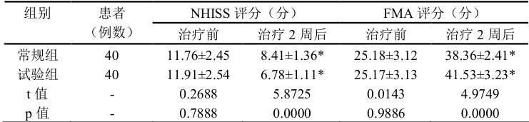 治疗 2 周后,试验组的 FMA 评分更高、NHISS 评分更低( (P<0.05) )。见表 2。
