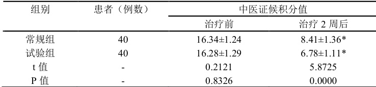 2.2 两组治疗前、治疗 2 周后的中医证候积分值比较治疗 2 周后,试验组中医证候积分值更低( (P<0.05) )。见表 3。