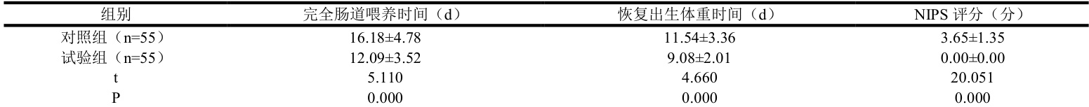 表 1 完全肠道喂养时间、恢复出生体重时间、NIPS 评分比较