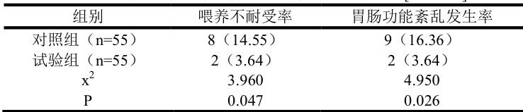 表 2 喂养不耐受率、胃肠功能紊乱发生率比较[n (% )]
