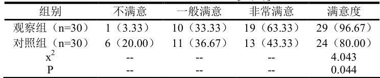 表 1 满意度数据统计显示观察组为 96.67% ,与对照组存在明显差异(P<0.05) 。