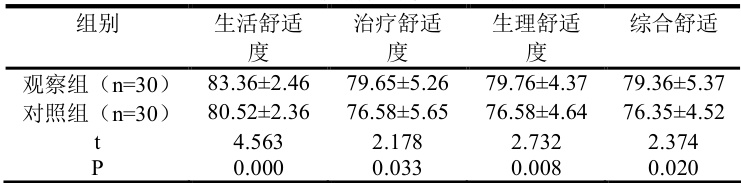 表 2 患者舒适度对比显示观察组得分更高,与对照组存在明显差异(P<0.05 )。