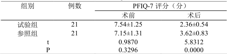 术前,两组 PFIQ-7 量表测评分数对比无差异, P>0.05 ;试验组术后PFIQ-7 评分相较于参照组更低, ρP<0.05 ,计算有差异,见表 1。