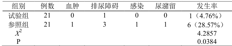 (2)观察患者在术后所产生的并发症,具体包括血肿、排尿障碍、感染、尿潴留,统计实际发生率。