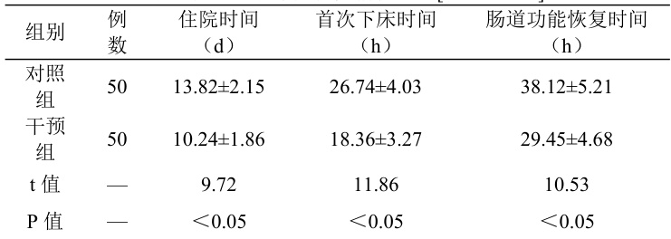 干预 3 个月后,干预组患者在术后住院时间、首次下床活动时间及肠道功能恢复时间方面均明显优于对照组。经t检验分析,三项指标组间差异均具有统计学意义( (P<0.05) ),具体数据见表1。