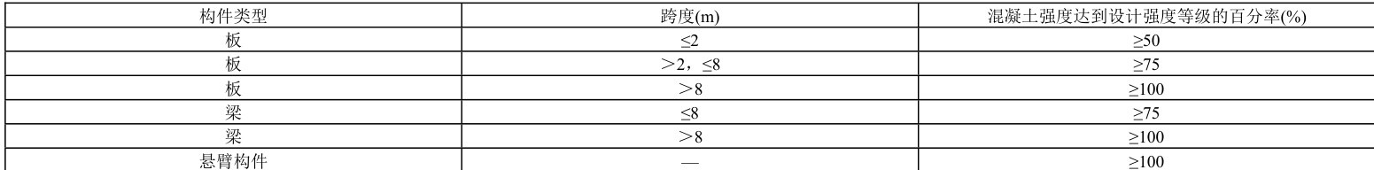 表 1 承重模板拆除时混凝土强度要求