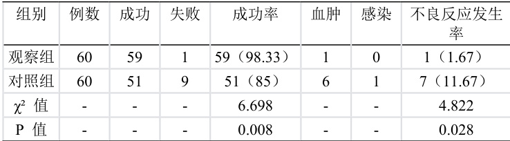 包括:(1)血肿(直径≥2cm);(2)穿刺点感染(24 小时后红肿、渗液);不良反应发生率 Σ=Σ (血肿 + 感染) /60*100.00% 。