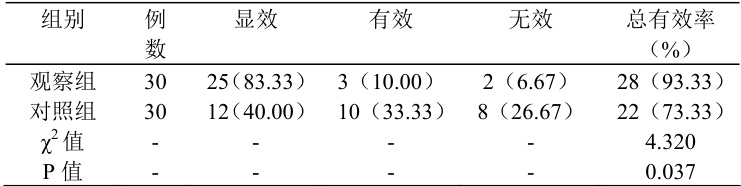观察组治疗总有效率高于对照组( ⋅P<0.05⋅ ),见表1 所示。