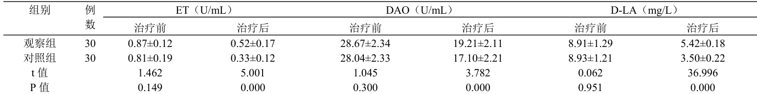 在治疗前后,对患者的血清内皮素(ET)、二胺氧化酶(DAO)及 D-乳酸(D-LA)水平进行检测。具体操作如下:于清晨时段,对患者进行血液样本采集,抽取量为 3 毫升的肘静脉血。随后,将采集的血液样本进行离心处理,离心条件设定为15 分钟,转速为3000 转/分钟。离心完成后,取上层血清部分,采用酶联免疫吸附法(ELISA)对上述生化指标进行检测分析。